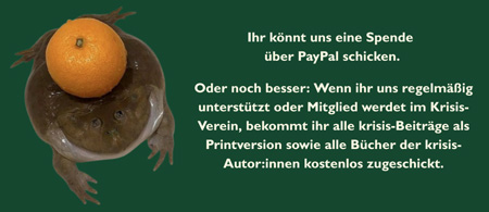 Den Beitrag überweise ich per Dauerauftrag auf das folgende Konto: Förderverein Krisis e.V., Postbank Nürnberg, IBAN: DE97 7601 0085 0300 1148 59